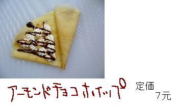 今日は「アーモンドチョコホイップ」をご紹介します。福州で食べる生クリームは、正直言ってあまりおいしくないです。でも、Yちゃんが作るクリームは日本と同じ味がします!そこにたっぷりのチョコレートソースとサクサクのアーモンドがかかったら、当然お・い・し・いです♪日本と同じようにおいしいこのクレープ、お値段も7元(日本円で105円)とお手ごろ価格。うれしいですね。