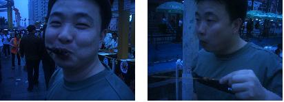 ふとある屋台に目をやると、虫が並んでいました!サソリや幼虫が串焼きになっています。恐る恐る近づく私とは対照的に、周りの中国人は何ともないかのように、列を成して買っていました。その中には管理人の主人も含まれており、身内ながら恐れおののきました。そして、彼は写真をご覧の通り、満面の笑みで食しておりました。