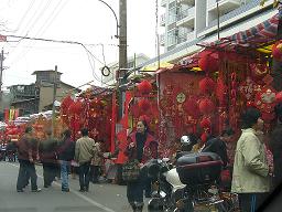 車で福州一の繁華街である東街口へ行ったのですが、駐車場はどこも満車。車を止める場所がなかなか見つかりませんでした。あちこちグルグルと回っているうちに、近くの南后街が見えました。ここは小さな個人商店がひしめき合っている通りです。道の両側は、春節に必要なグッズを売る屋台でいつも以上に賑やかです。遠くから見ても、赤い色が目にも鮮やか。中国のお正月が来た!という感じがしますね。