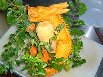 厨房の男の子が「デジカメを貸して」と言うので何かと思ったら、前回に続いて野菜で龍を彫刻したとのこと。いい感じの仕上がりらしく、写真を撮りたいようでした。